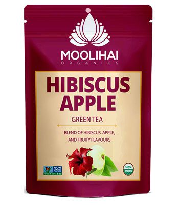 હિબિસ્કસ એપલ ગ્રીન ટી એ એક તેજસ્વી લાલ રંગની ચા છે, જેમાં હિબિસ્કસ ફૂલ, સફરજનના ટુકડા, ઓરેન્જ પીલ, દાલચિની, લવિંગ, અલ્ફાલ્ફા પાંદડા, લીલી ચા, લીમડાંના છાલ, ગુલાબ અને કેસુડાના ફૂલોનું આરોગ્યદાયી મિશ્રણ છે. આ ચાને ગરમ પીણું તરીકે પણ લઈ શકાય છે અને ઠંડા આઈસ્ડ ચા તરીકે પણ માણી શકાય છે.