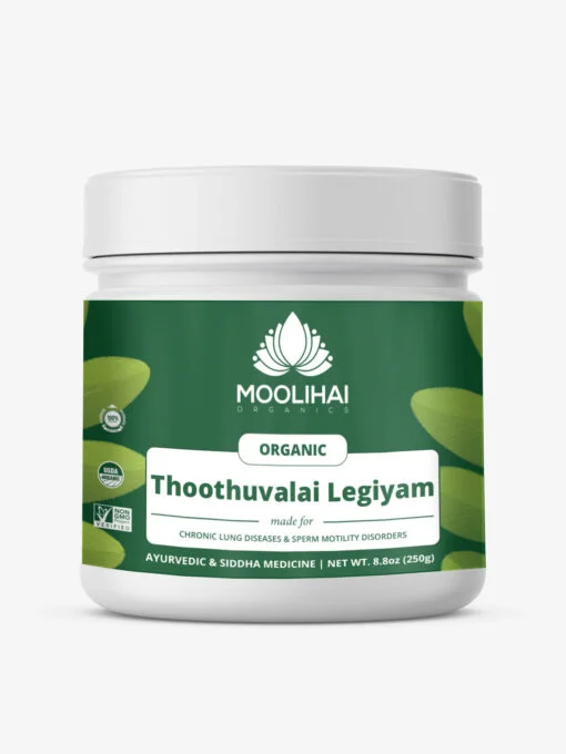 Thoothuvalai Legiyam is a classical medicines legiyam form that effectively reduces all kinds of diseases. Thoothuvalai is a medicinal herb that offers more health and therapeutic benefits. It helps to treat Chronic lung Diseases, Sperm motility disorders, and Immune modulators. Thoothuvalai is used in culinary to make many dishes such as thuthuvalai soup, chutney, rasam, thuvaiyal, and dosai. It is very beneficial for pregnant women and babies.